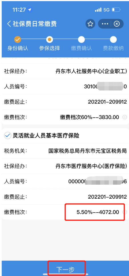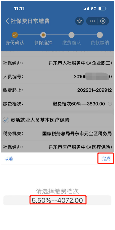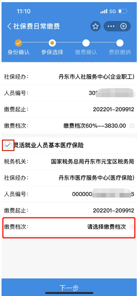 第三步,进入“辽宁社保缴费”主页后,点击【社保费日常缴费】。第四步,选择办理身份,若选“我是经办人”可以代他人办理。第五步,录入缴费人员的身份信息,点击【下一步】按钮。第六步,如本年未选择缴费档次(以丹东市灵活就业基本医疗保险为例),点击【请选择缴费档次】。选择档次后,点击【完成】。