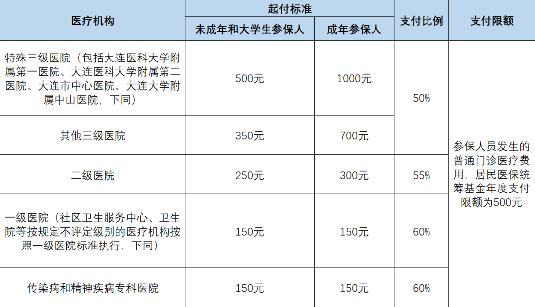 ①普通门诊医疗费用:按年度支付,为年度累计起付标准。普通门诊医疗费用,医保一年最高可以报销500元。具体门诊报销待遇见下表
