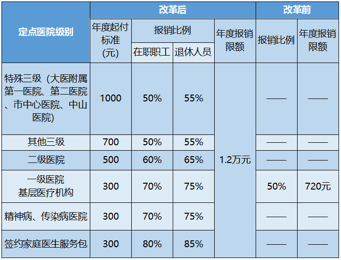 医保待遇主要有两个方面,住院待遇和门诊待遇。职工医保门诊共济改革实施以来,门诊报销待遇大幅提高,住院待遇不变。改革后,职工门诊医药费报销待遇提高如下: